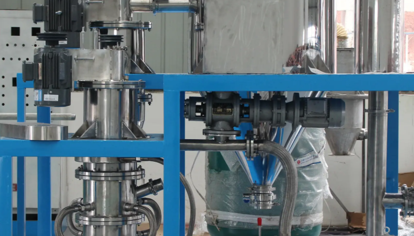流化床气流粉碎机和旋风分离器、除尘器、引风机形成一套完整的粉碎系统。压缩空气经过滤干燥后,通过拉瓦尔喷嘴高速喷入粉碎腔,多芯高压气流交汇处的物料反复受到冲击、摩擦、切割粉碎后,粉碎后的物料在风机抽力的影响下随上升气流移动到分级区。在高速分级涡轮产生的强离心力的影响下,粗细物料被分离。符合粒度要求的细颗粒通过分级轮进入旋风分离器和除尘器收集,粗颗粒下降到粉碎区继续粉碎。