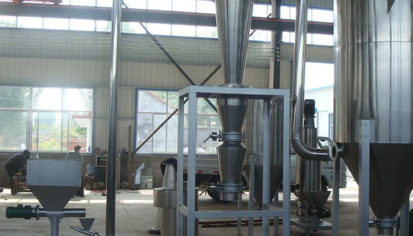 压缩空气通过喷嘴在粉碎区域高速喷射,促进粉末原料高速运动,在四个喷嘴交界处高速冲击,实现自身冲击粉碎,粉碎材料随负压上升到分级区域,颗粒通过分级轮高速离心力和风机负压凝聚力,颗粒离心力越大,颗粒通过分级轮叶片间隙进入旋风除尘器和收集器收集。被离心力抛出的大颗粒返回粉碎区域,继续粉碎。