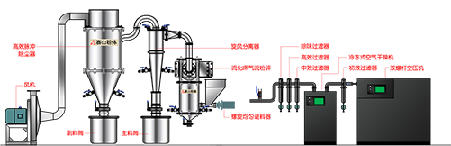 有压气体经机内数个喷嘴加速,形成向心高速射流,激波,物料在射流交汇区发生剧烈的对冲撞击,摩擦而被粉碎。高速粒子互撞的速度是两相对速度的迭加。机内物料呈流化沸腾状。又在压差作用下随气流一起向上运动至分级区,在分级涡轮旋转离心力和机外引力等共同作用下,粉体中的小颗粒被分离通过了分级轮排出机外进入收集系统,成为符合设定要求的成品。较粗颗粒则被拒绝在涡轮流场外,回落至粉碎区被粉碎,反复不间断地循环。成品粒径随分级涡轮转速而调节,分选精度则取决于成熟的设计和精湛的制造技艺。